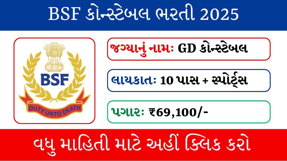 BSF Bharti 2025 : ભારત સરકારના ગૃહ મંત્રાલય હેઠળની બોર્ડર સિક્યુરિટી ફોર્સ (Border Security Force – BSF) દ્વારા કોન્સ્ટેબલ (જનરલ ડ્યુટી) – Constable (General Duty – GD) ની પોસ્ટ માટે સ્પોર્ટસ ક્વોટા હેઠળ ભરતીની જાહેરાત કરવામાં આવી છે. આ ભરતીમાં રમતગમત ક્ષેત્રે ઉત્કૃષ્ટ પ્રદર્શન કરનાર મેરીટોરિયસ સ્પોર્ટ્સ પર્સન્સ પાસેથી ઓનલાઈન અરજીઓ મંગાવવામાં આવેલ છે.